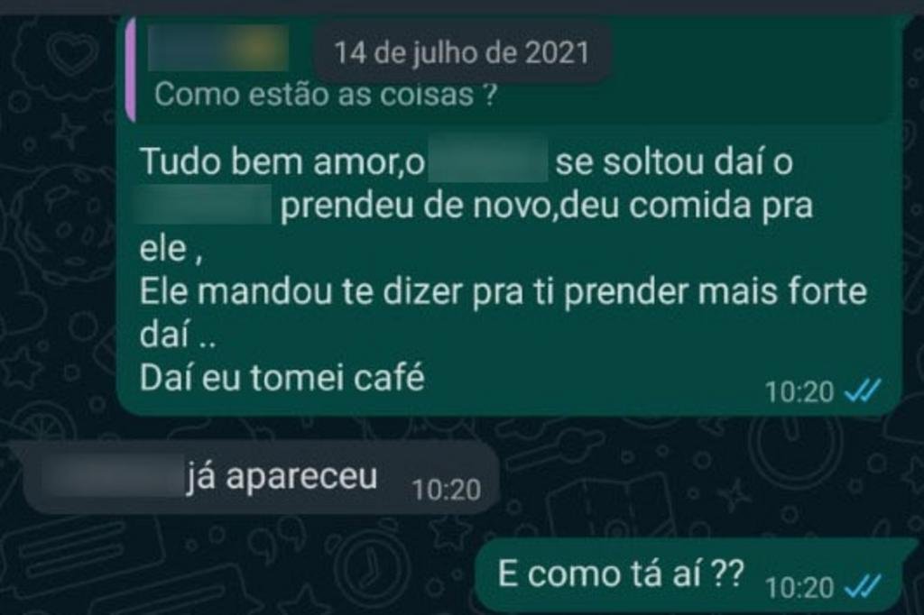 Dias após o ocorrido, em outra troca de mensagens, a companheira presa neste domingo conta para a mãe do menino que ele havia se “soltado” das correntes. Ela ainda cita o nome de um homem, que teria prendido novamente a criança, e mandado avisar que o menino teria que ser preso com “mais força”.